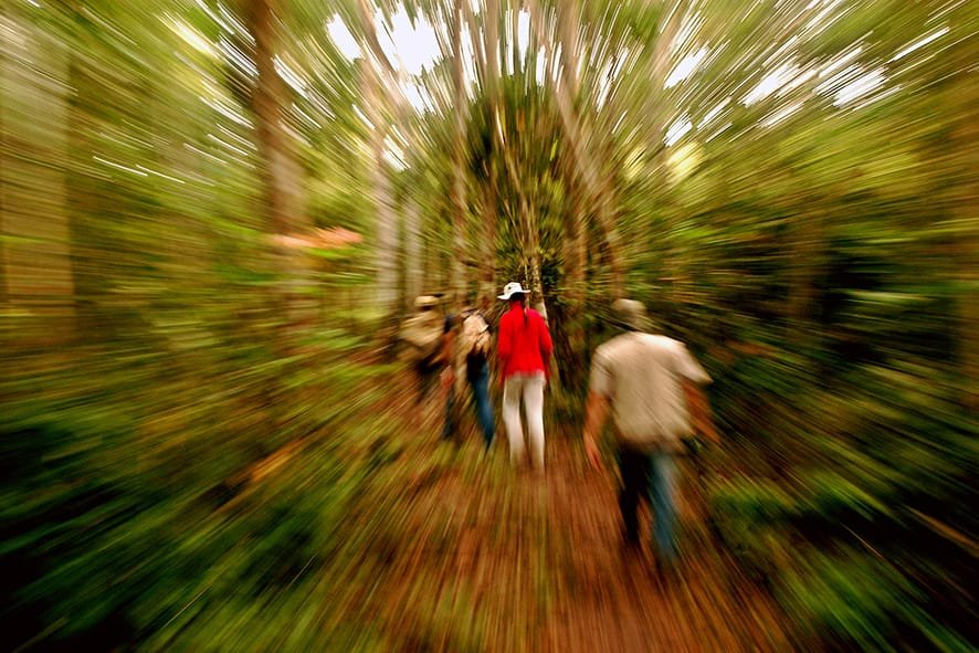 As atividades se iniciam com uma caminhada junto aos mateiros em uma vivência dentro da Floresta, com oportunidade de aprender a reconhecer plantas nativas, além de passeios de barco e banhos de igarapé.