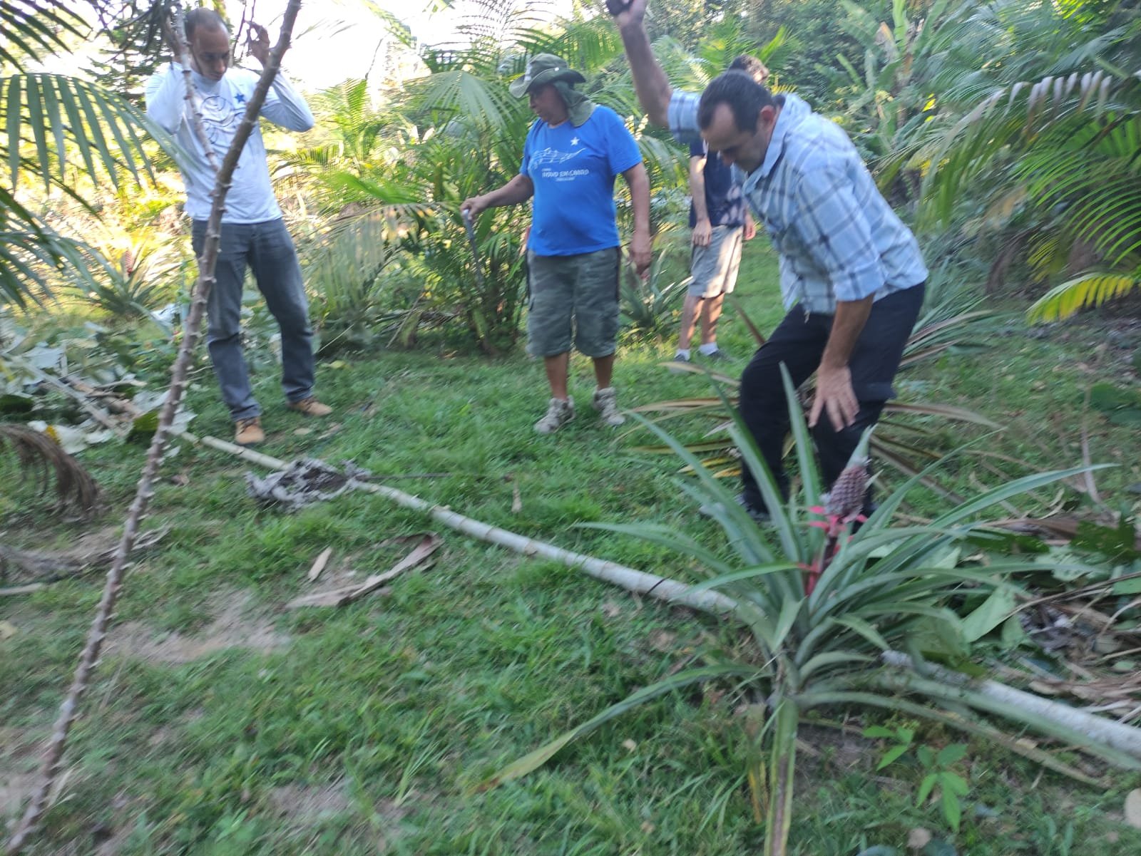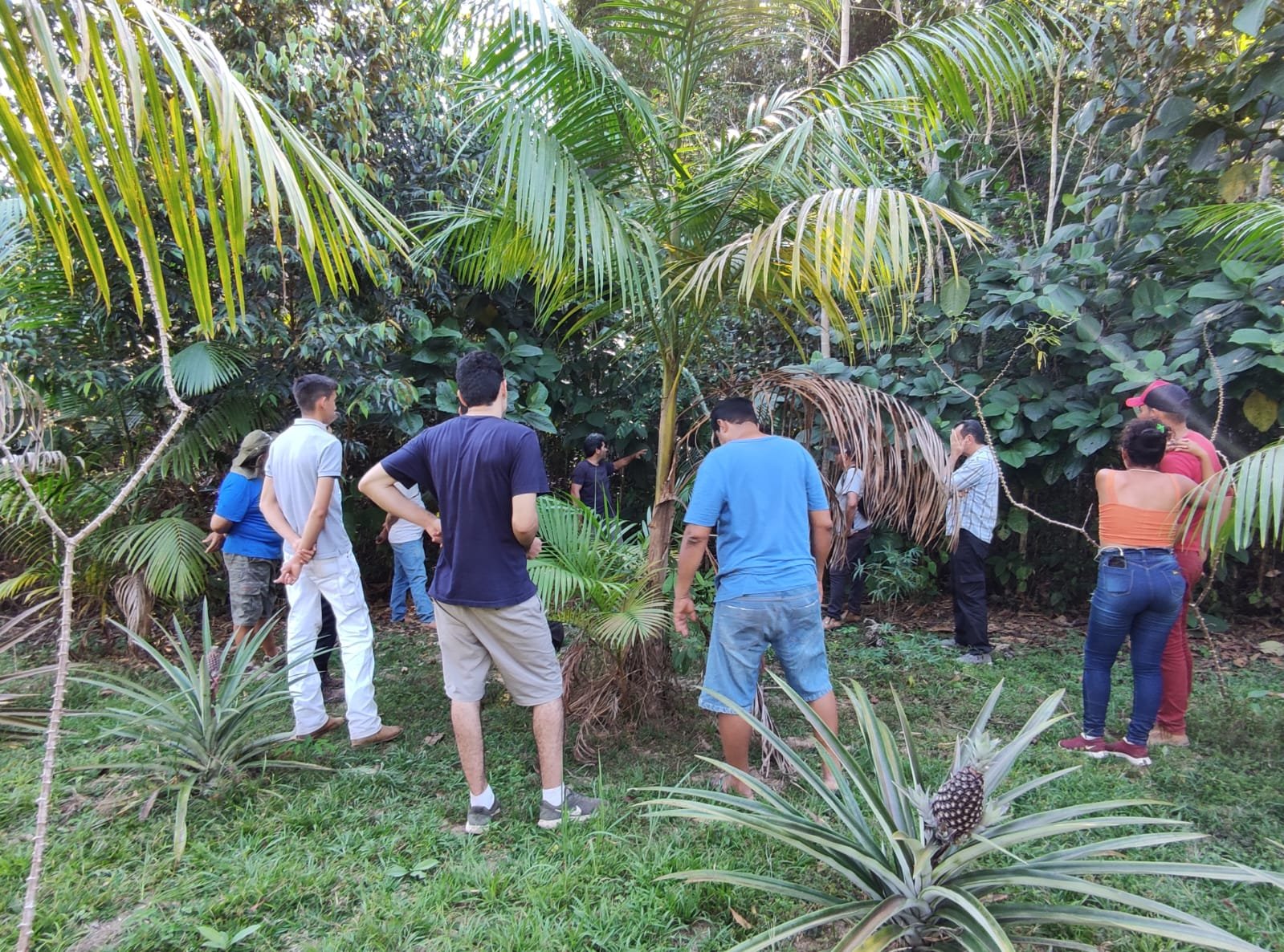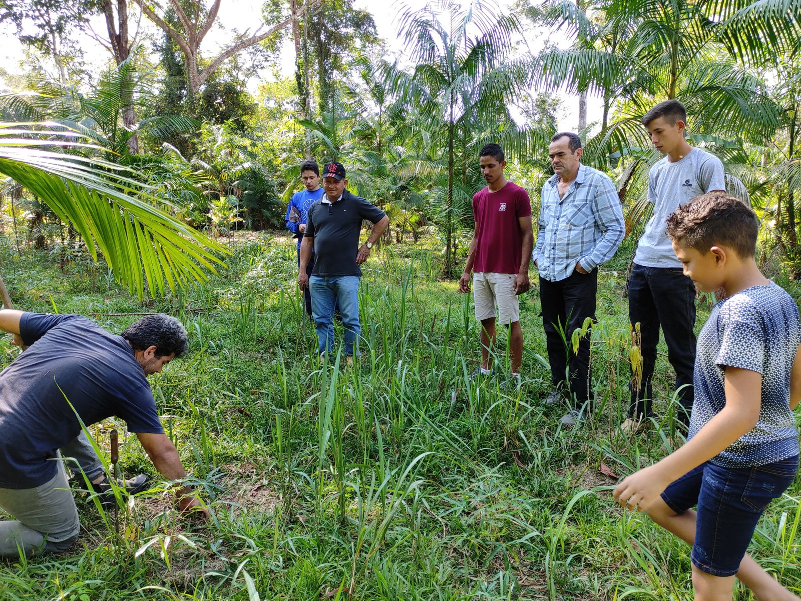 – analisando, juntos com o instrutor “Peu” e os monitores Alisson e Emanuel, as pessoas, de FORMA PARTICIPATIVA, escolheram as áreas para introdução de mais 145 novas plantas no SAF (Sistema Agroflorestal): mudas de cacaueiros, açaizeiros, castanheiras, coqueiros, cupuaçuzeiros, seringueiras, mulateiros, paus d’arco e sementes de quiabo, maxixe e pepino, próprios para se desenvolverem com a pouca umidade atmosférica desse período do ano, na Floresta Amazônica.