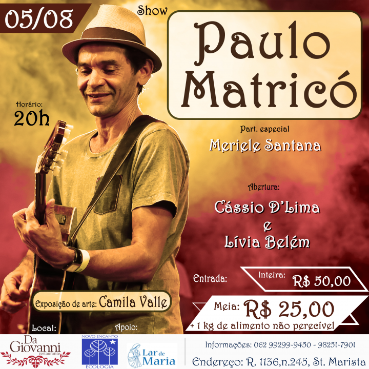 No dia 5 de Agosto acontece em Goiânia o show com o cantor Paulo Matricó, com o apoio da Novo Encanto. A abertura do show será feita por Cássio D’Lima e a …