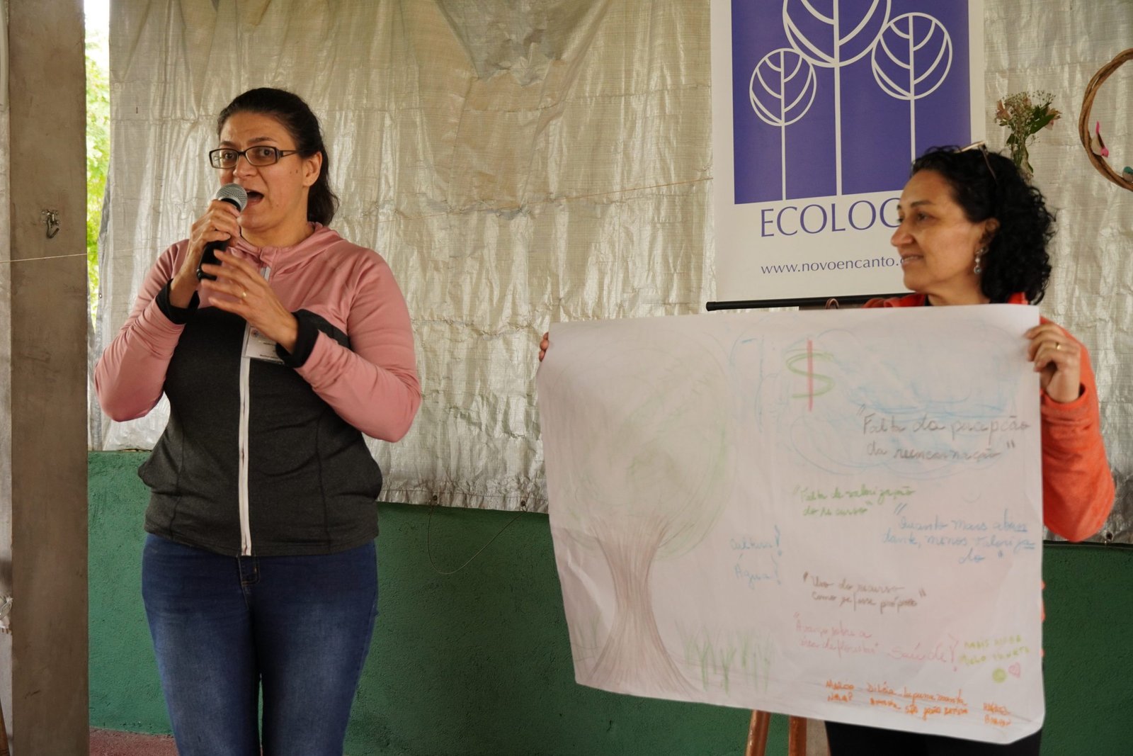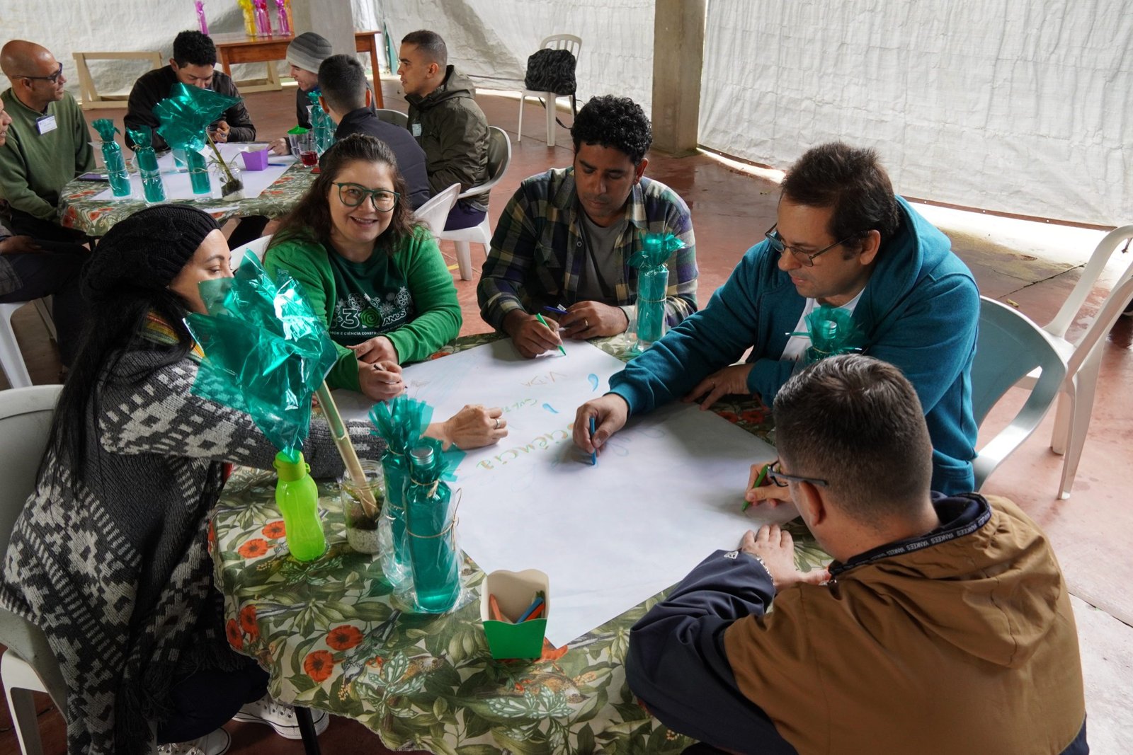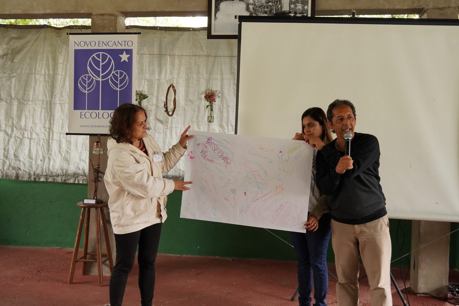 Ainda de manhã a coordenação do encontro promoveu uma vivência de Tai Chi com José de Oliveira (Tito) que proporcionou aos participantes um momento de conexão entre corpo e mente e um clima tranquilo que durou todo encontro. E, em sequência, Raquel Stefanuto, Assessora da Diretoria de Formação Ambiental, conduziu uma dinâmica que envolveu os participantes do encontro na elaboração de possíveis ações que a Novo Encanto pode fazer, a nível nuclear, para reforçar os pilares da sustentabilidade, ABC (Água, Biodiversidade e Cultura). Foram produzidos cartazes com desenhos e mapas mentais retratando as ideias propostas pelos grupos de participantes.