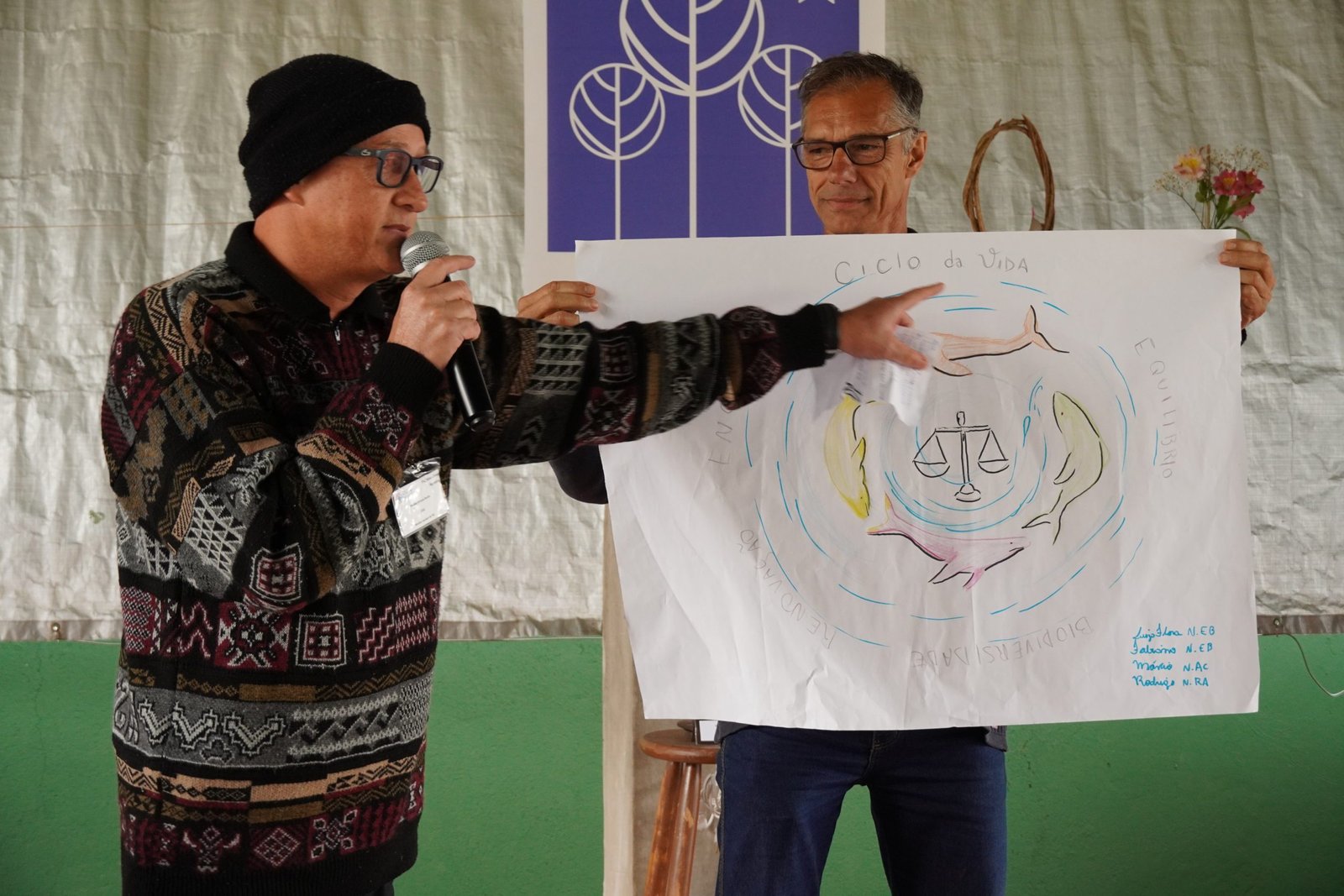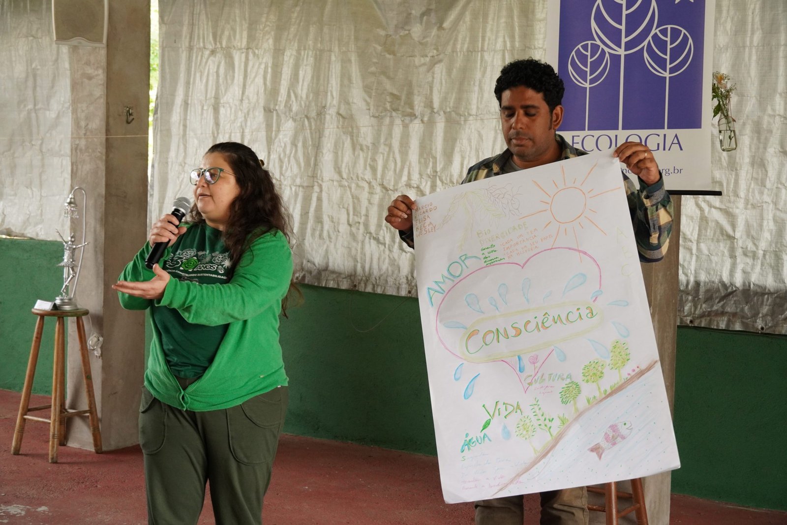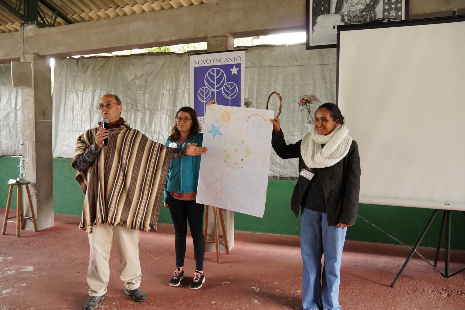Ainda de manhã a coordenação do encontro promoveu uma vivência de Tai Chi com José de Oliveira (Tito) que proporcionou aos participantes um momento de conexão entre corpo e mente e um clima tranquilo que durou todo encontro. E, em sequência, Raquel Stefanuto, Assessora da Diretoria de Formação Ambiental, conduziu uma dinâmica que envolveu os participantes do encontro na elaboração de possíveis ações que a Novo Encanto pode fazer, a nível nuclear, para reforçar os pilares da sustentabilidade, ABC (Água, Biodiversidade e Cultura). Foram produzidos cartazes com desenhos e mapas mentais retratando as ideias propostas pelos grupos de participantes.
